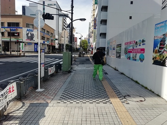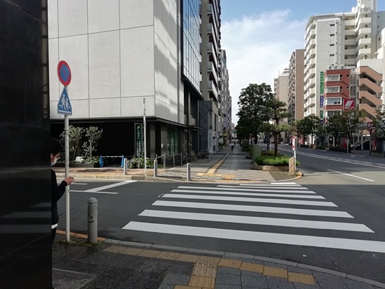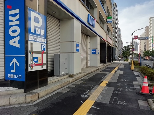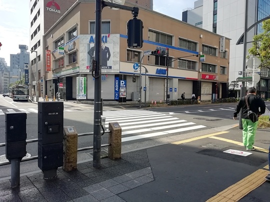 6.横断歩道を渡り終えたら右に向きます。写真は右を向いたところで、左側は紳士服のAOKI、その奥にJTBがあります。