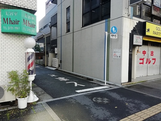 散髪屋さん、ゴルフ用品店、この2つを確認してその間の細い道に入ります。ゴルフ用品店を通り過ぎないで左に曲がるよう、お気をつけください。