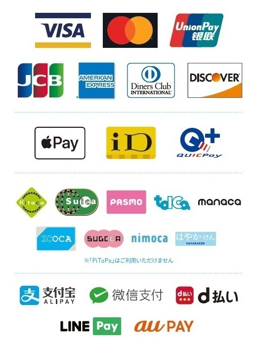お支払いには、以下のクレジットカードと電子マネーが使えます。お支払前にお申し出ください。