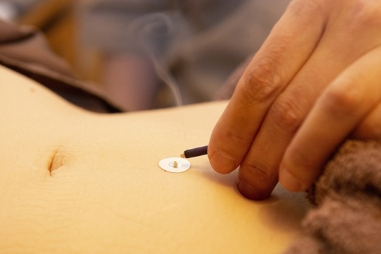 またお灸は、艾をつまんで肌にのせる昔ながらの方法でやっています。この方法では、熱が内部に通るまで回数を調節できますのでより効果的です。もちろんやけどしたら大変ですので、灸点紙というやけど防止シールを貼ってお灸をしています。